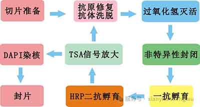 酪酰胺信号放大(TSA ,Tyramide signal amplification)技术, 由二 抗 上偶联的HRP酶催化非活化的荧光素底物生产活化的荧光素底物, 活化的荧光素底物能共价结合到 抗原表位, 然后通过抗原修复( 抗体洗脱 ) 将非共价结合的一抗二抗洗脱掉,最后周而复始的把不同的荧光素结到 抗 原 表 位 达 到 多 标 的目 的 。TSA技 术 的 实 验 就 叫 做 多 重 免 疫 组 织 化 学 ( Mutiple immunohis tochemistry , mIHC)。